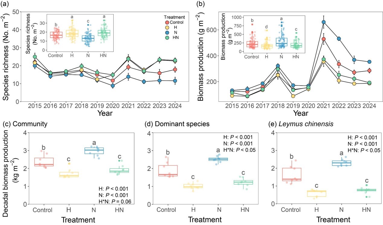 Figure 1. Interannual dynamics of species richness (a) and aboveground productivity (b) in a meadow steppe under factorial treatments of nitrogen input and annual haying, and cumulative aboveground biomass production of the community (c), dominant species (d), and Leymus chinensis (e) over a 10-year period (Image by LV Xiaotao).